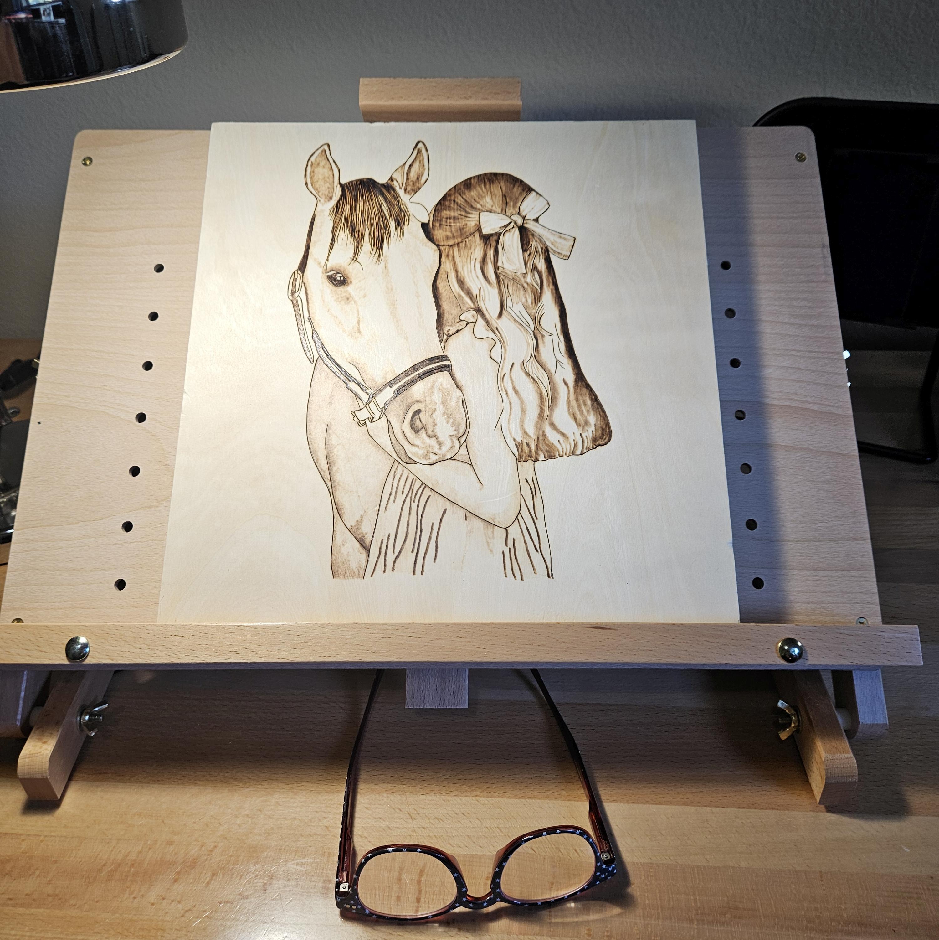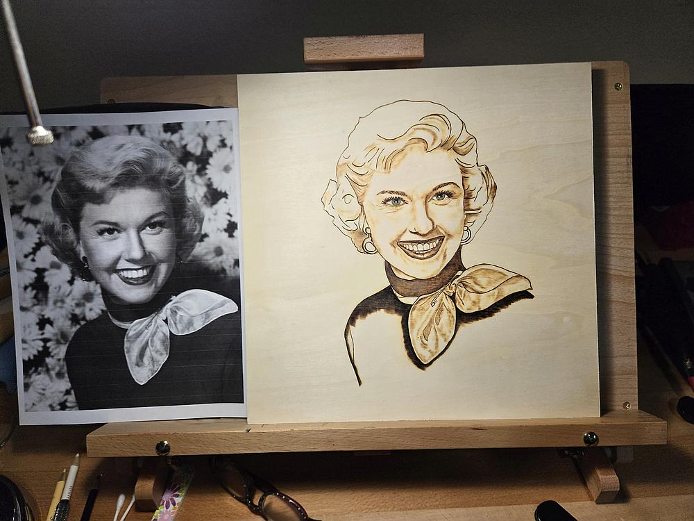 Lastly, I’ll mention that I’ve been having fun digging back into some art projects in my free moments. This wood burning of Doris Day is the piece currently sitting on my workbench waiting to be finished -