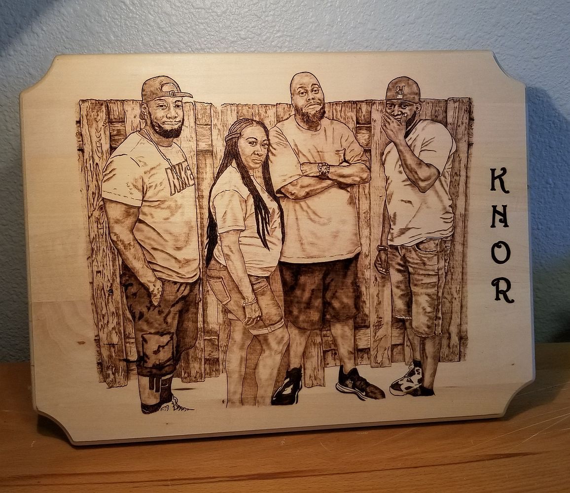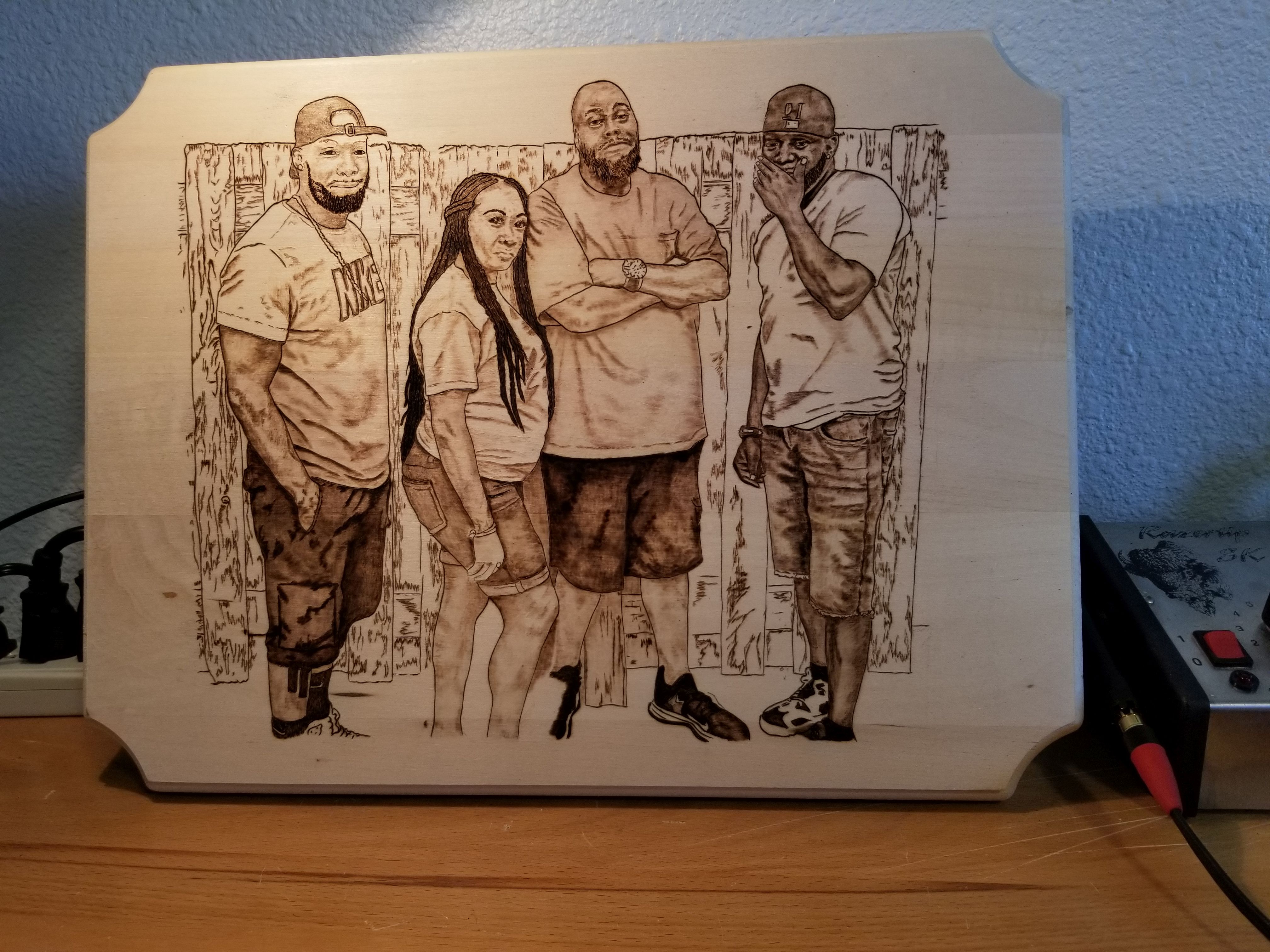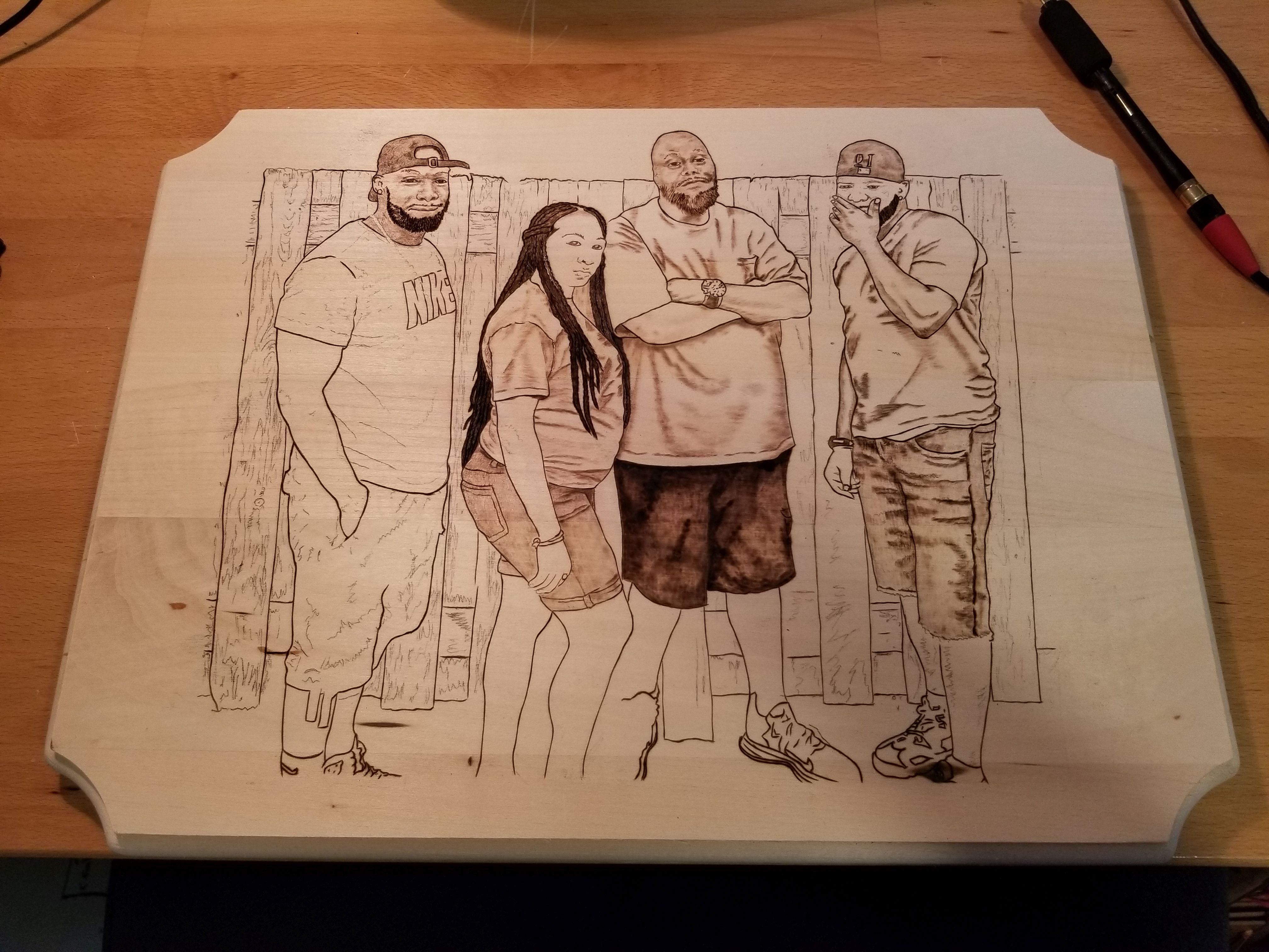 This is a portrait I was commissioned by my son-in-law to burn. The piece depicts four siblings, and they all went in on the piece as a Christmas gift for their mother. In this video, I'm burning the initial outline after hand-transferring the art outline to the surface of the wood.