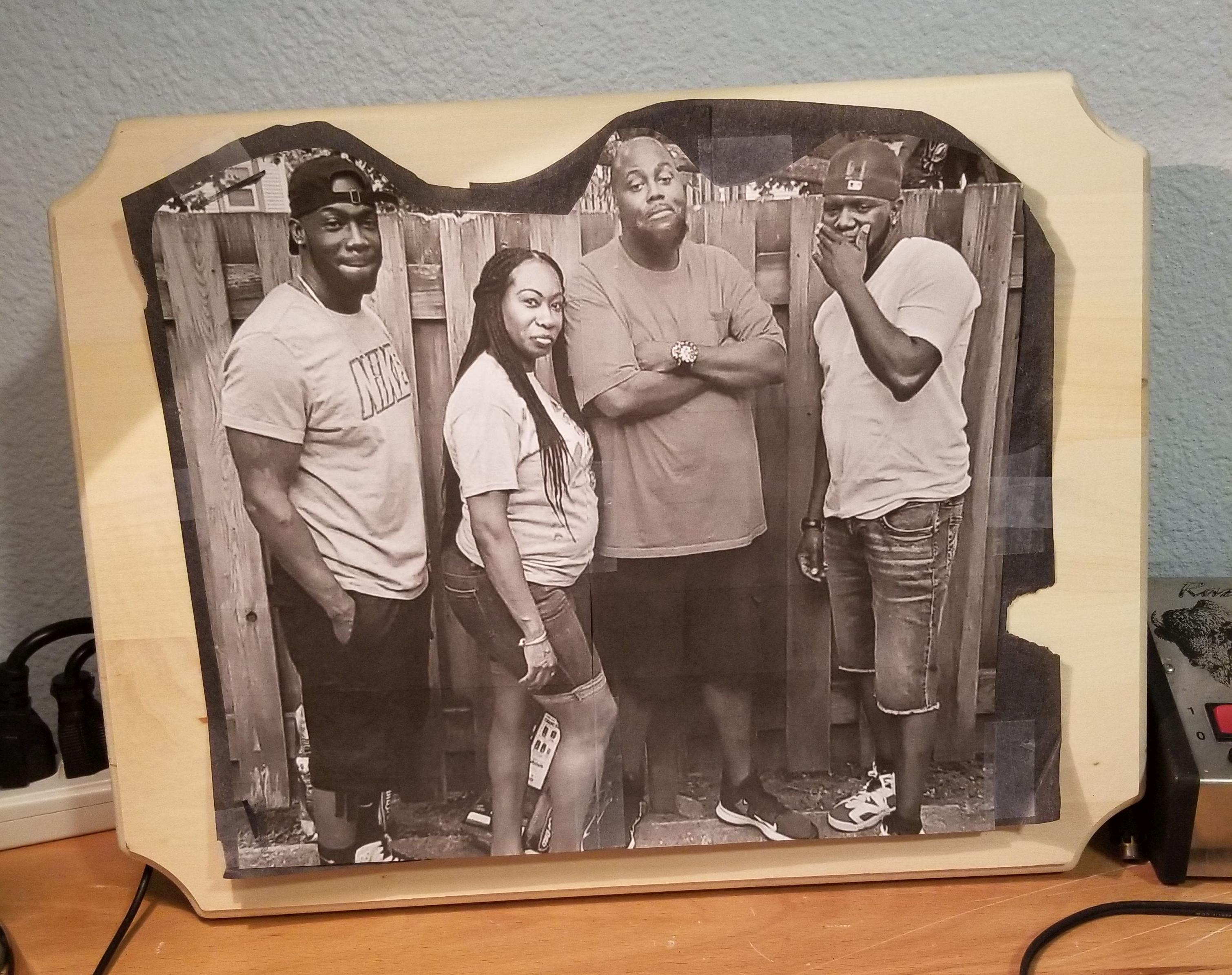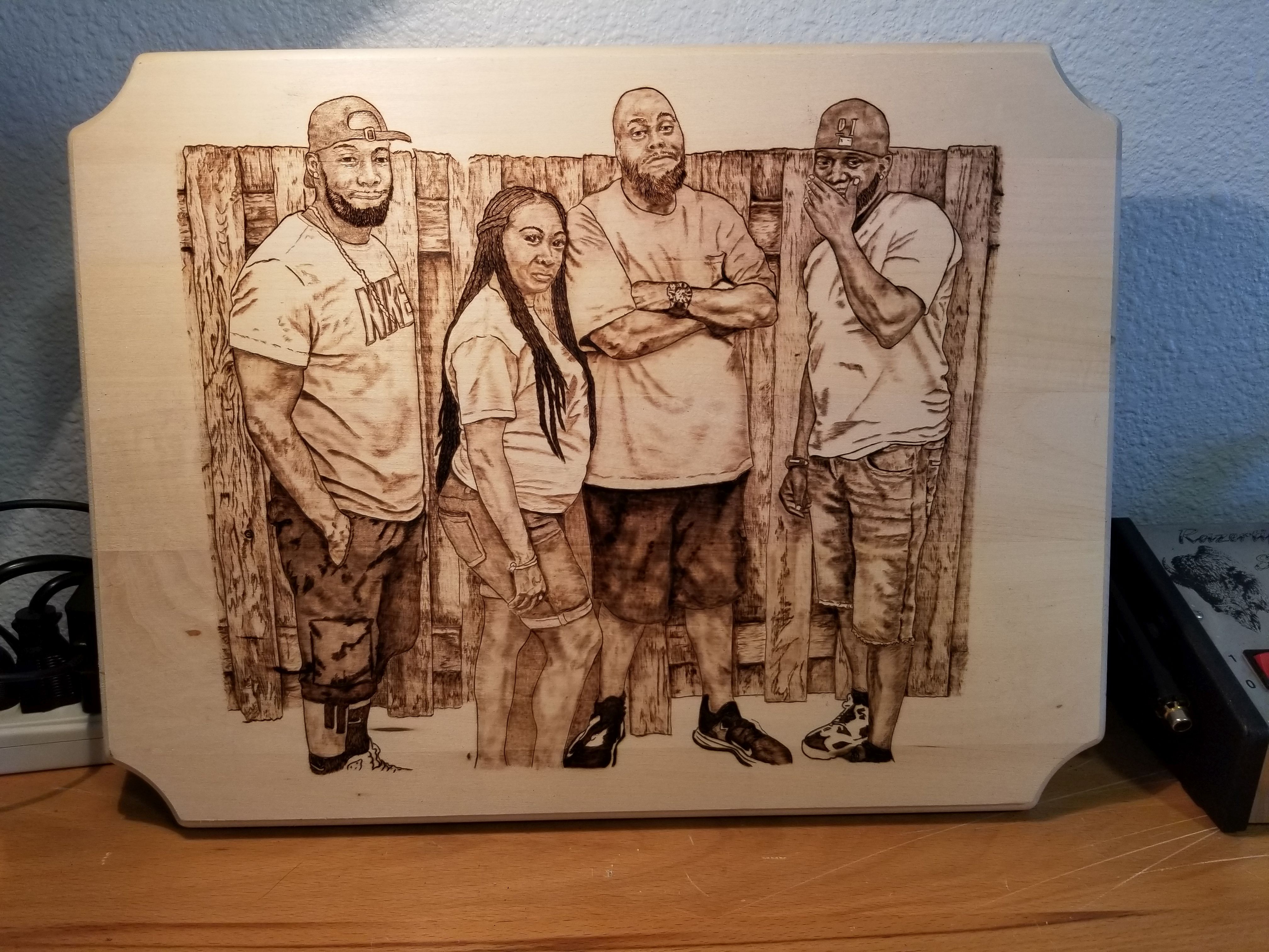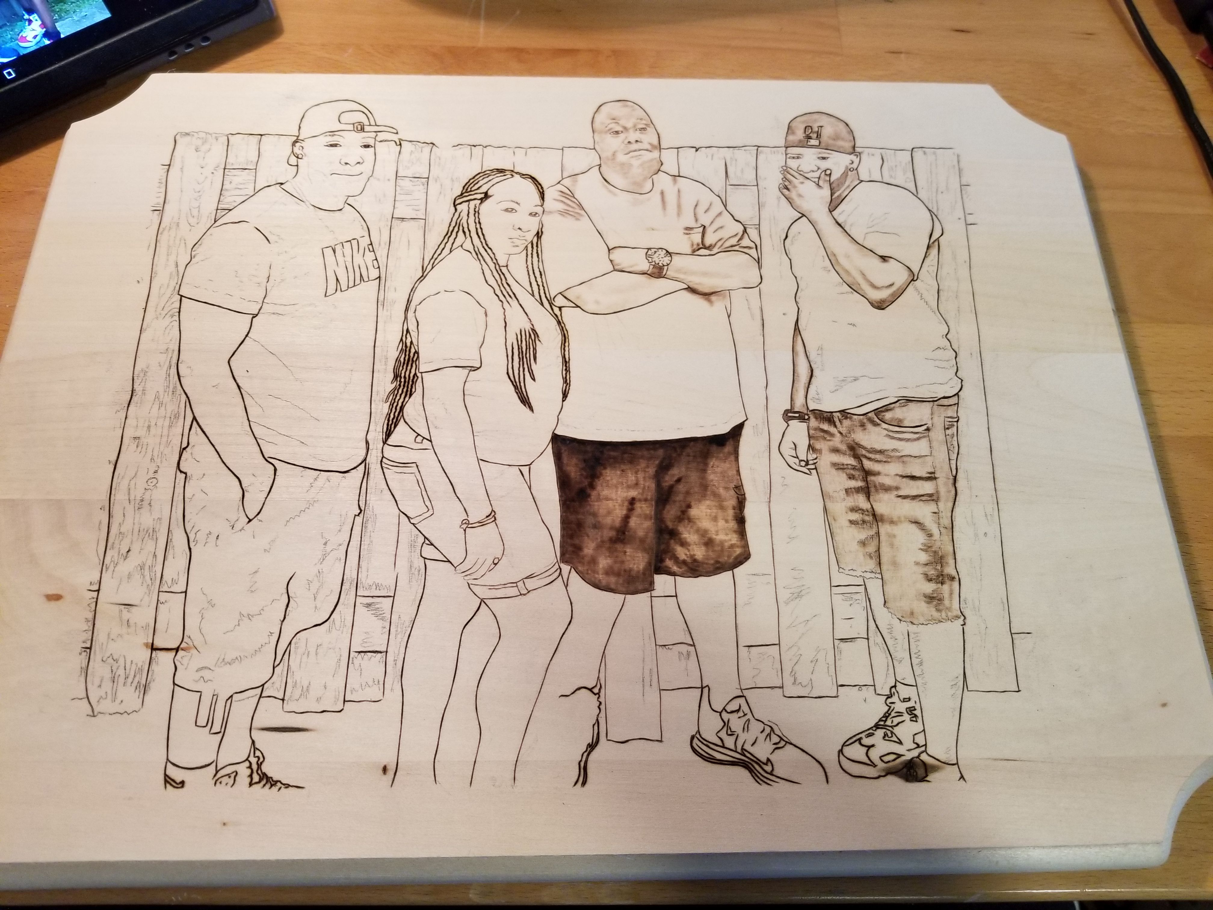 This is a portrait I was commissioned by my son-in-law to burn. The piece depicts four siblings, and they all went in on the piece as a Christmas gift for their mother. In this video, I'm burning the initial outline after hand-transferring the art outline to the surface of the wood.