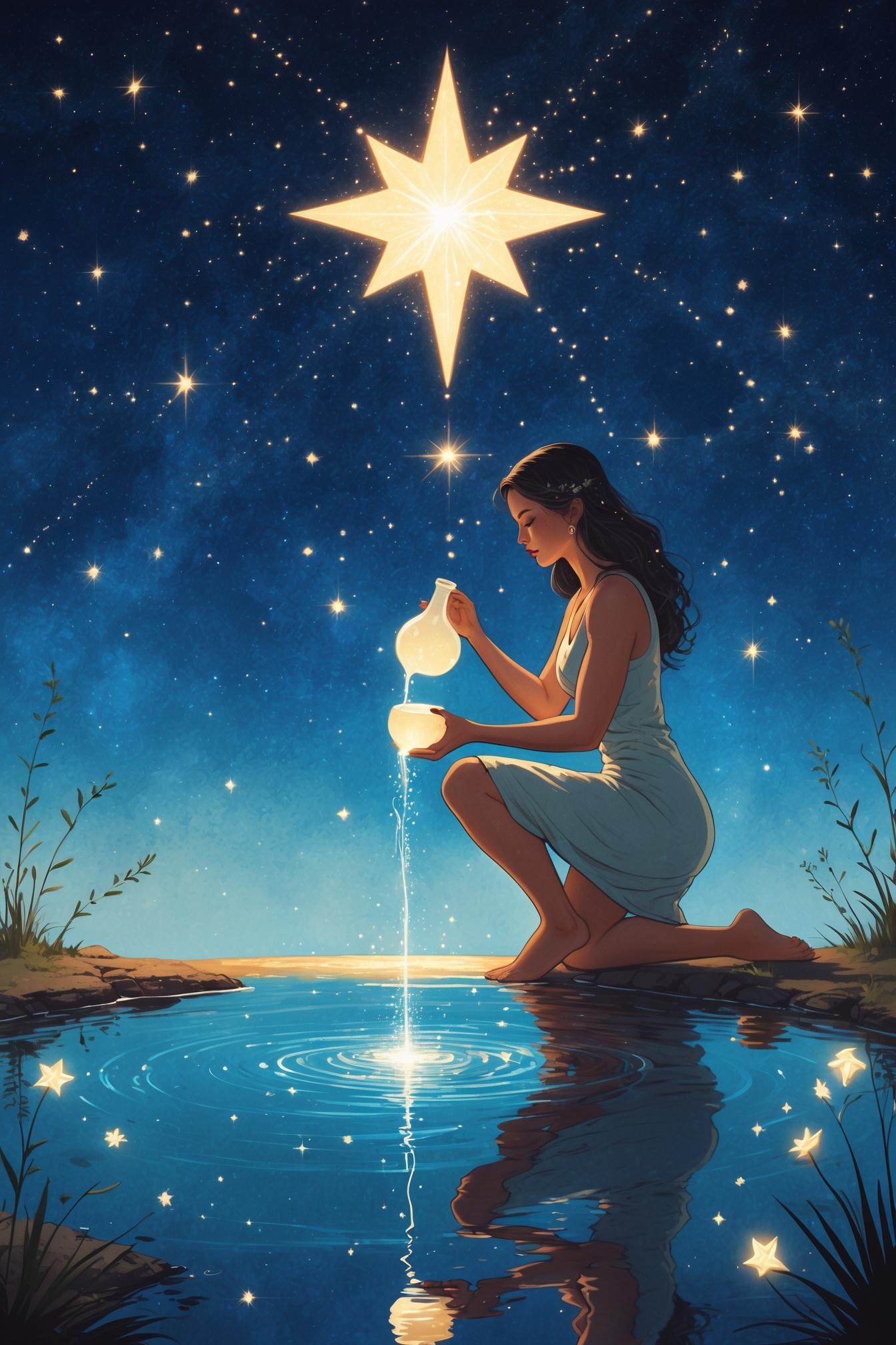 A woman kneeling at the edge of a still pool, two vessels in her hands, pouring — one into the water, one onto the earth. Stars are shining everywhere above her. She isn't performing. She's not explaining herself. She is just observing, steadily, in the dark.