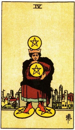 In classical tarot, the Four of Pentacles depicts a crowned figure seated firmly on a stone throne. He holds one pentacle tightly to his chest, wears one beneath each foot — as if afraid the earth itself might take them — and balances a fourth atop his head like a crown he refuses to release. His posture is rigid. His city is behind him, not in front. He has turned his back on community, on movement, on possibility.
