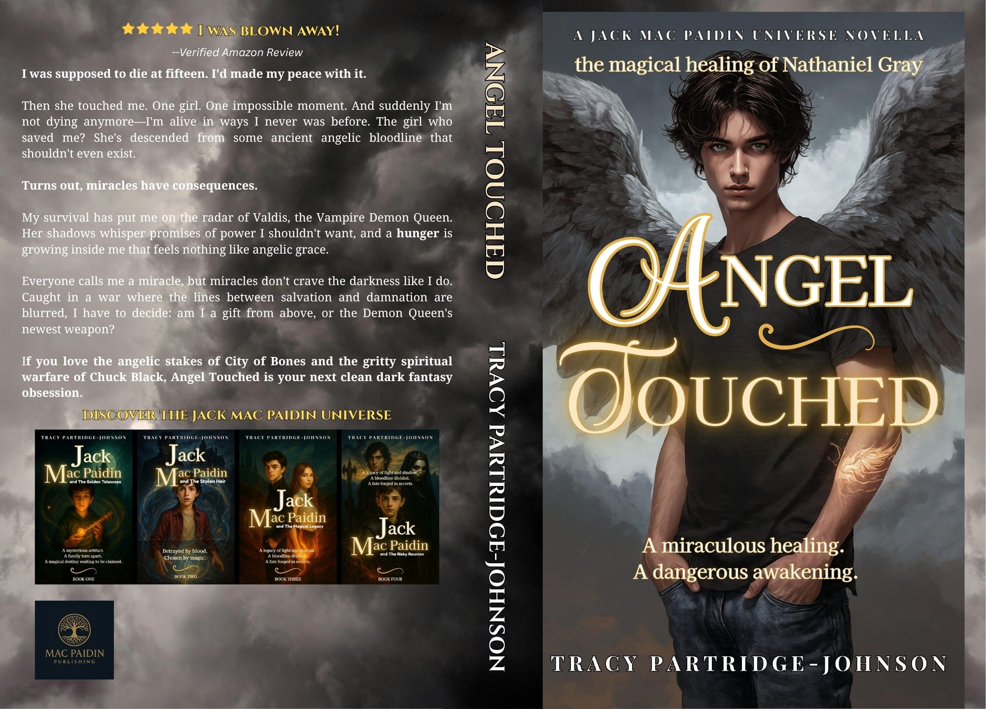 So I gave them what they were asking for. And I loved writing that story. There's something electric about a character who surprises you — who walks in as a supporting player and demands more of the page. Angel Touched is a novella, a side story that spun out of a single scene in Book Three. It's my most recently published work in the series, and it holds a special place in my heart.